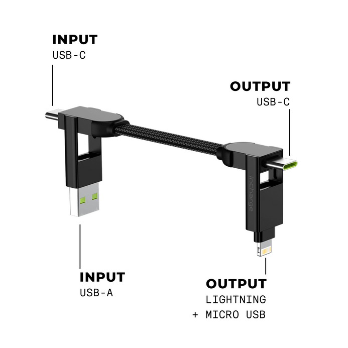inCharge® X allows your phone or your tablet to become a power source you can use when standard charging ports are not nearby (only available using USB-C phone as input).